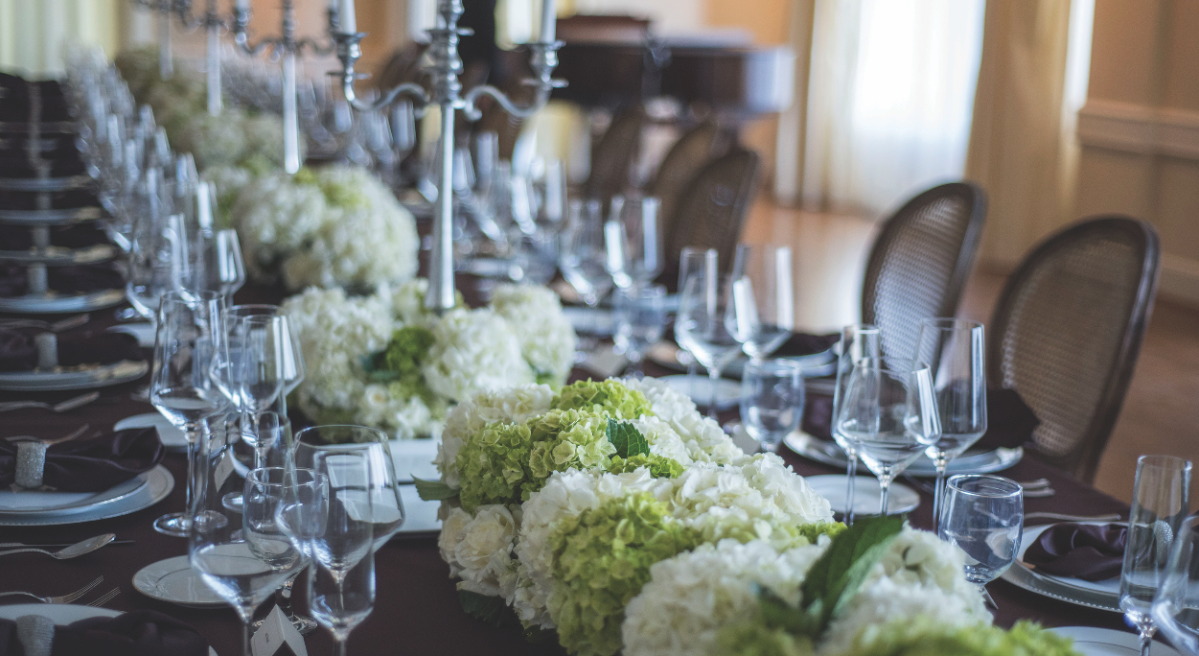 Six 6-foot rectangle tables, eight 10-foot round tables, 80 Chiavari chairs, and linens